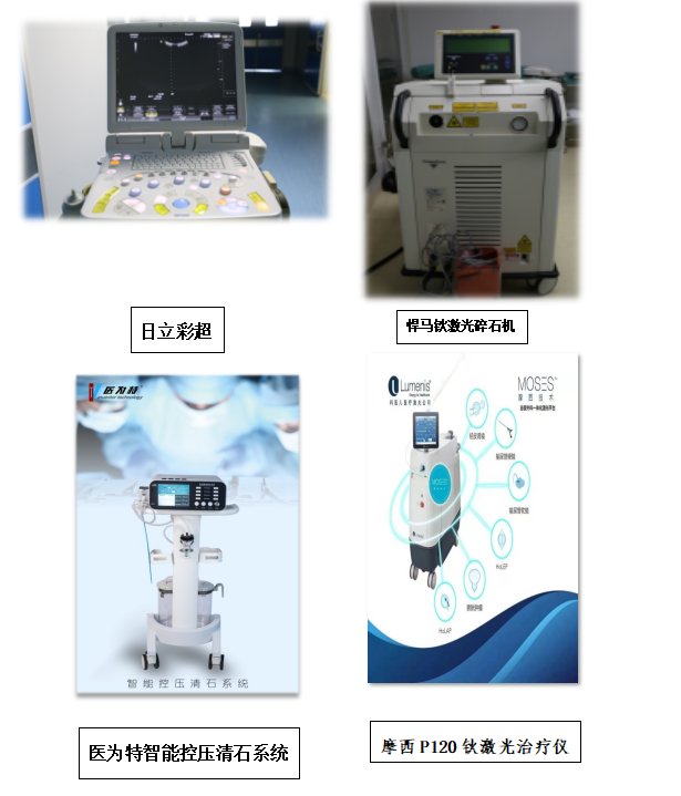 科室擁有3D及4K電子腹腔鏡、摩西鈥激光及悍馬鈥激光治療儀、尿流動力學分析儀、前列腺電切鏡、等離子電切鏡、膀胱鏡、輸尿管硬鏡、微創(chuàng)經(jīng)皮腎鏡、標準經(jīng)皮腎鏡、鉑立可視穿刺腎鏡系統(tǒng)、智能控壓軟鏡清石系統(tǒng)、超聲碎石清石系統(tǒng)(EMS)、夜間陰莖勃起功能檢測儀、精子分析儀、性功能障礙治療儀、體外震波碎石機、直腸B超、日立彩超等先進醫(yī)療設備。