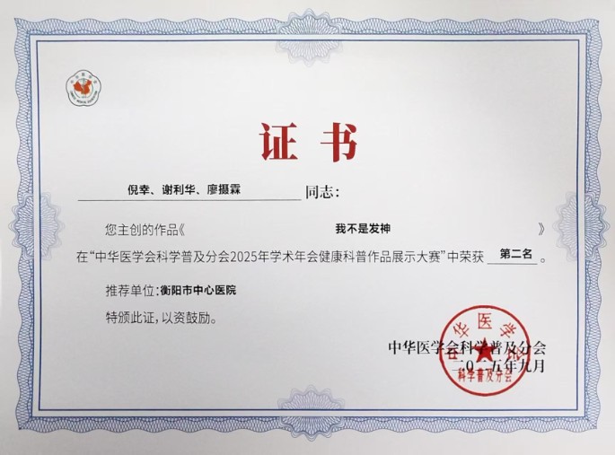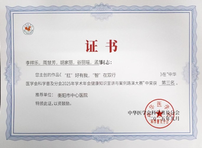 通訊員王旋報道:9月26日至28日,中華醫(yī)學會科學普及分會2025年學術年會在江西南昌召開。在健康科普創(chuàng)新大賽環(huán)節(jié),衡陽市中心醫(yī)院皮膚科、乳甲外科和肛腸外科選送的科普作品,分別榮獲健康科普作品展示大賽第二名和健康知識與案例路演大賽第二名、第三名的好成績。