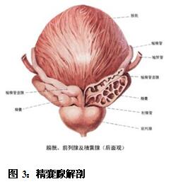 1、精囊腺的解剖及功能: 精囊腺位于膀胱底與直腸之間,在輸精管末端的外側。是一對長橢圓形的囊狀器官,表面凹凸不平,下端為排泄管,與輸精管末端匯合成射精管(圖3)。精囊腺分泌精囊液(果糖、凝固蛋白Semenogelin 1,前列腺素等),成為精液的一部分。精囊能儲存少量精子,且有豐富微血管,極易損傷出血;性高潮射精時,平滑肌強烈收縮,微血管破裂出現血精。