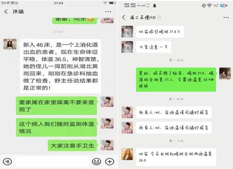 群眾肯定就是對(duì)我們工作最大鼓舞。大年初一晚上20:08分,晚班護(hù)士李娜接診了一位上消化道出血的患者,經(jīng)詢問(wèn)病史及家屬,得知該患者侄子是從武漢回來(lái)的,隨即將其“隔離”在單人間,并迅速安排患者侄子前往我發(fā)熱門診進(jìn)行檢查,同時(shí)耐心的向患者講解相關(guān)疾病宣教以及注意事項(xiàng),并給患者及其家屬發(fā)放了口罩,及時(shí)安撫患者緊張焦慮情緒并告知患者防護(hù)措施?;颊邔?duì)此感激地說(shuō)道:我們會(huì)按照你去做的,真的是辛苦你們了!因此,當(dāng)我們的護(hù)士交班量血壓時(shí),患者還會(huì)主動(dòng)將口罩帶好,頭偏向另外一側(cè)。就這樣一個(gè)暖心的動(dòng)作,讓我們的護(hù)士工作更加賣力。