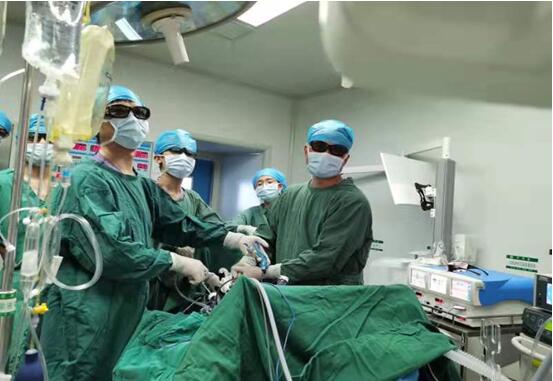 2020年2月28日,手術團隊在3D腹腔鏡下為患者行巨脾切除術。因為病人曾行介入脾臟栓塞術,手術遠比想象中困難,巨脾與左側(cè)肝臟、膈頂、左側(cè)腹膜、結腸脾曲均有致密粘連,改變平時手術順序,先結扎脾動脈,離斷脾蒂,最后再分離脾周韌帶及粘連。完整切除巨脾后,分成小塊從小孔取出。