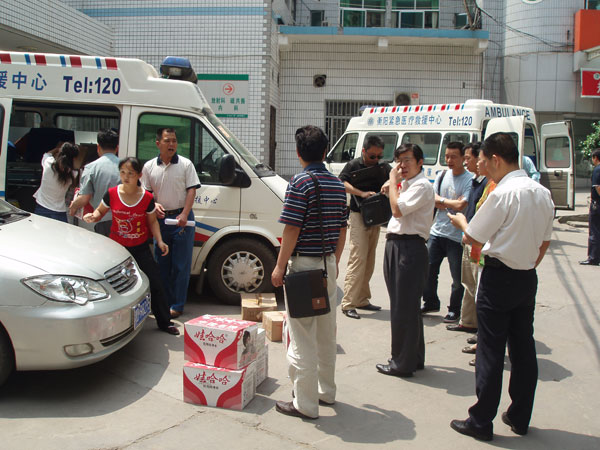 5月13日下午,市中心醫(yī)院憑著多年積累的緊急救援經(jīng)驗和職業(yè)敏感,在第一時間開始啟動《重大自然災害醫(yī)療救援應急預案》,成立了專門組織機構,配備了相關醫(yī)務人員和物資,設計了具體工作流程。5月14日上午8時,醫(yī)院院長申錦林在接到上級指令后,當即提出“把保護災區(qū)人民生命安全放在第一位”,立即通知相關人員進行集結。半個小時后,6名年輕力壯的司機,3臺配置呼吸機、監(jiān)護儀、除顫儀等一流搶救設施的救護車以及相關急藥品和食品迅速組織到位。11時許,在劉小平副院長的帶領下,三支救護隊按照要求從醫(yī)院整裝出發(fā),下午兩點抵達省衛(wèi)生廳與兄弟醫(yī)院匯合,隨即趕赴災區(qū)。